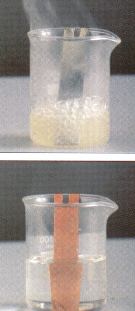 El zinc, así como otros metales activos situados por encima del hidrógeno en la serie elctroquímica,desplazan el hidrógeno de ácidos como el HCl, desprendiéndose hidrógeno gaseoso en forma de burbujas (vaso de arriba). En cambio el cobre y los metales nobles, plata, oro, platino, etc., situados por debajo del hidrógeno en dicha serie , no reaccionan con estos ácidos (vaso de abajo). |